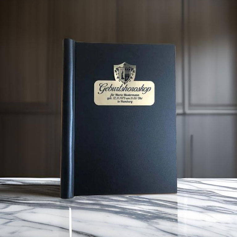 Ihr persönliches Geburtshoroskop wird für Sie in einem edlen Hardcover-Buch mit festem Einband mit Ledernarbung gebunden. Den Einband schmückt ein goldenes Emblem mit dem Namen des Horoskopinhabers.
