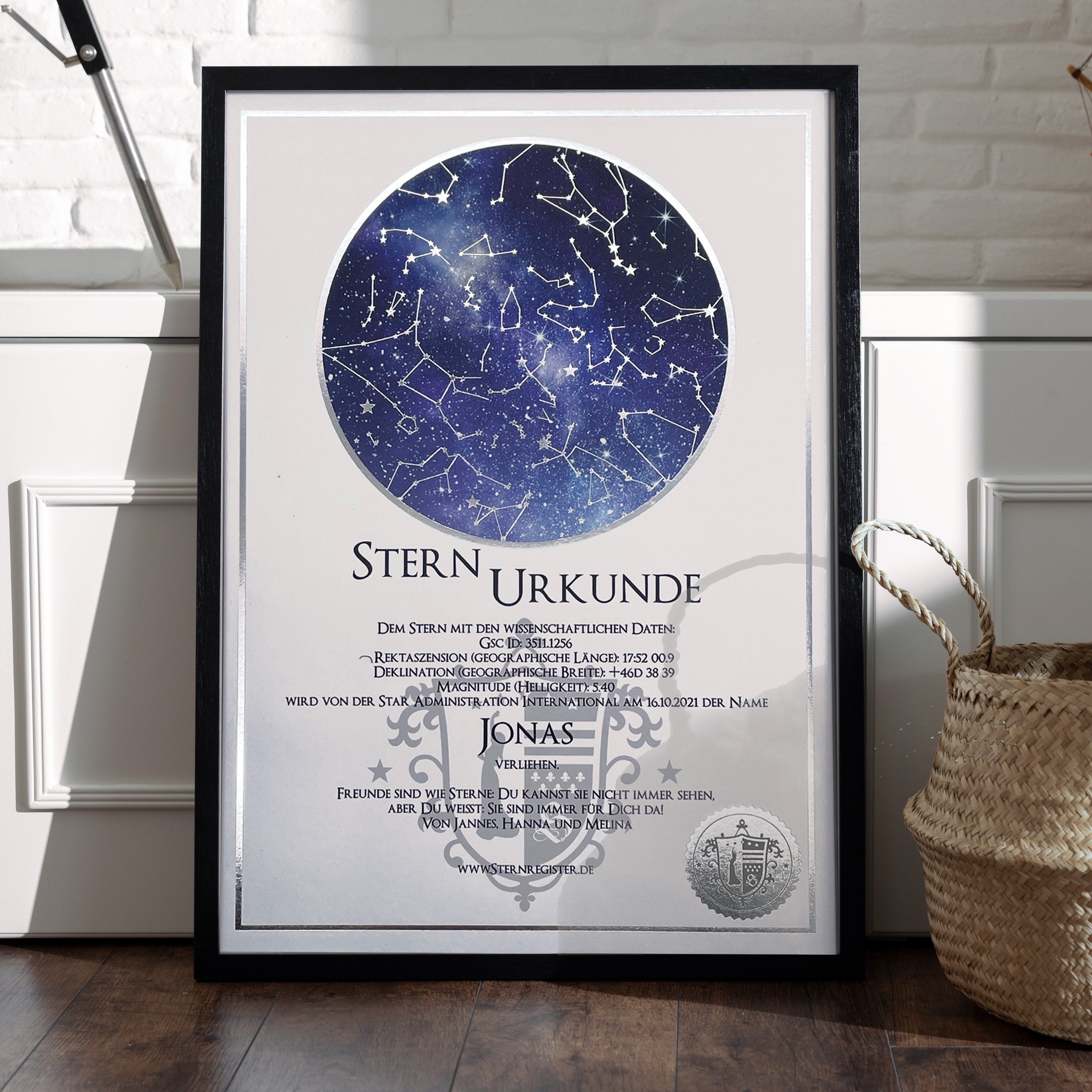 Der von Ihnen gewählte Sternname, das Taufdatum und die Koordinaten Ihres Sterns werden für sie auf den Stern graviert.