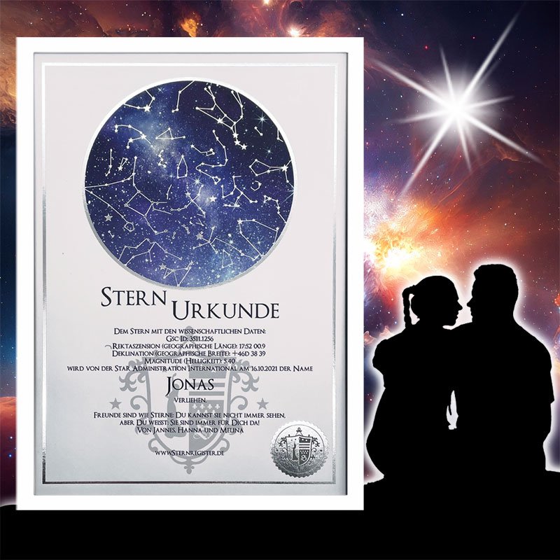 Ein Doppelstern ist ein Stern, der aus zwei sich gegenseitig umkreisenden Einzelsternen besteht. Doppelsterne eignen sich besonders gut als Partner-, Liebes- oder Hochzeitsgeschenke! Bei diesem Sterntaufe-Paket erhalten Sie die Sternurkunde in zweifacher Ausführung.