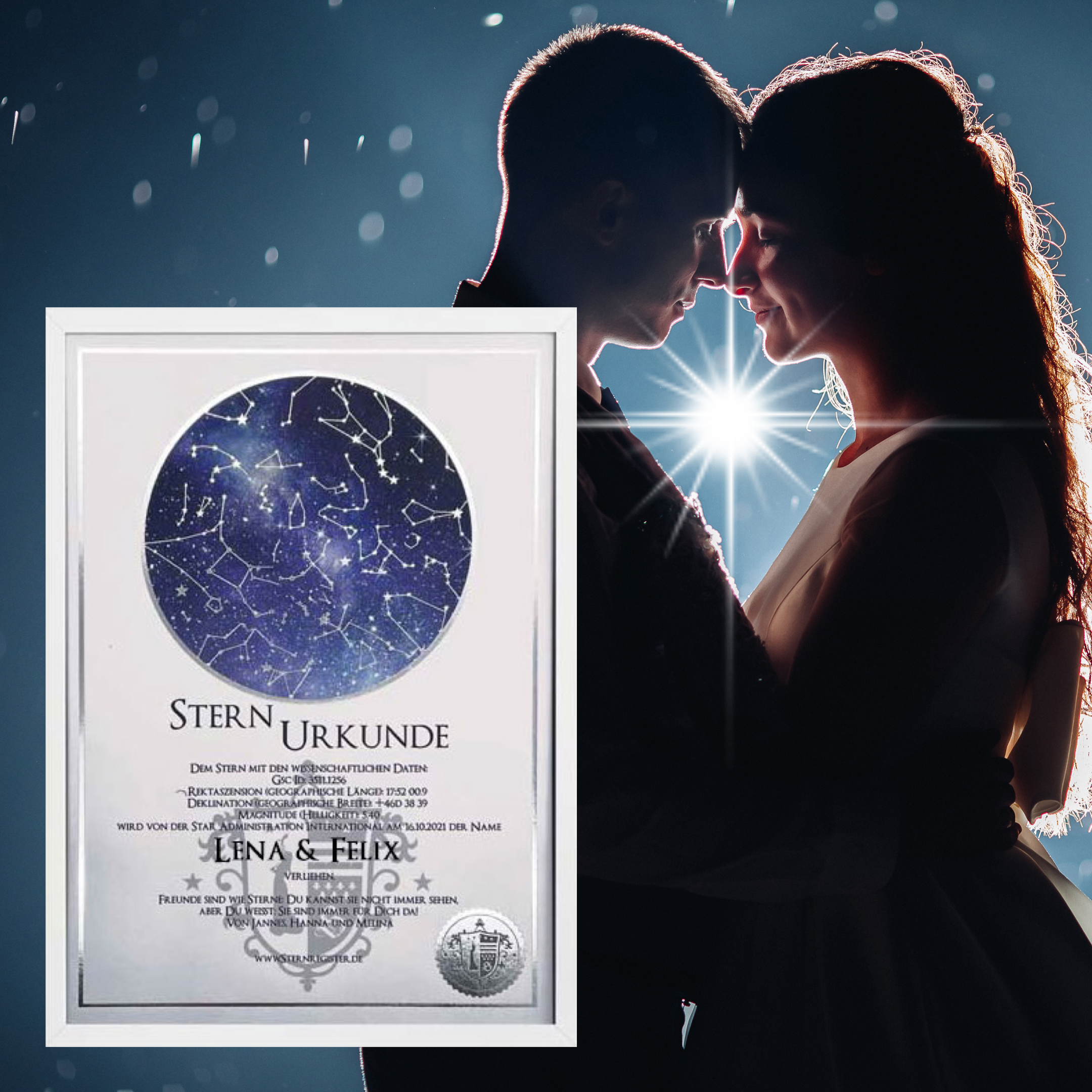 Der von Ihnen gewählte Sternname, das Taufdatum und die Koordinaten Ihres Sterns werden für sie auf den Stern graviert.