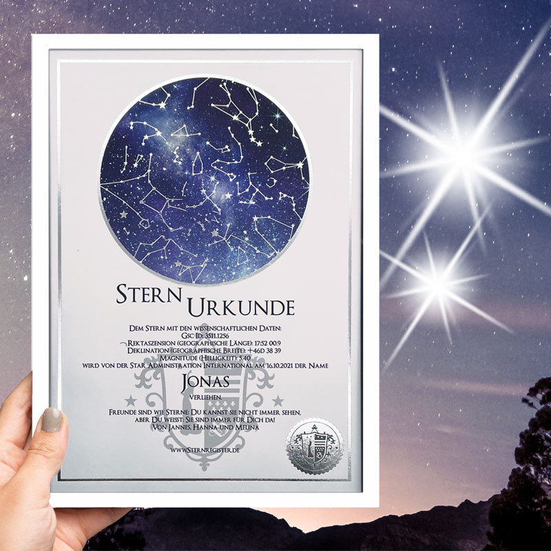 Der von Ihnen gewählte Sternname, das Taufdatum und die Koordinaten Ihres Sterns werden für sie auf den Stern graviert.