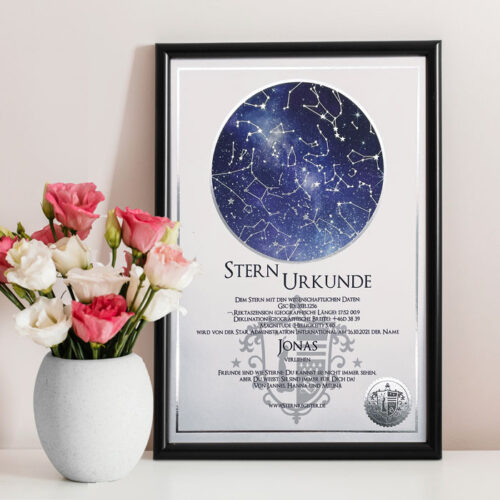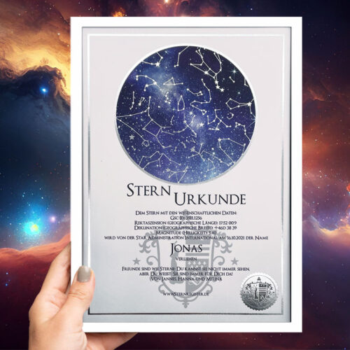 Die Sternurkunde ist das Herzstück der Sterntaufe: Sie dokumentiert ihren persönlichen Eintrag in das internationale S.A.I.-Sternregister®. Neben dem von Ihnen gewählten Sternnamen und dem Taufdatum sind auch die wissenschaftlichen Daten und Koordinaten Ihres Sterns auf der Urkunde angegeben. Optional können Sie Ihrer Sternurkunde auch eine persönliche Widmung hinzufügen – natürlich kostenlos.